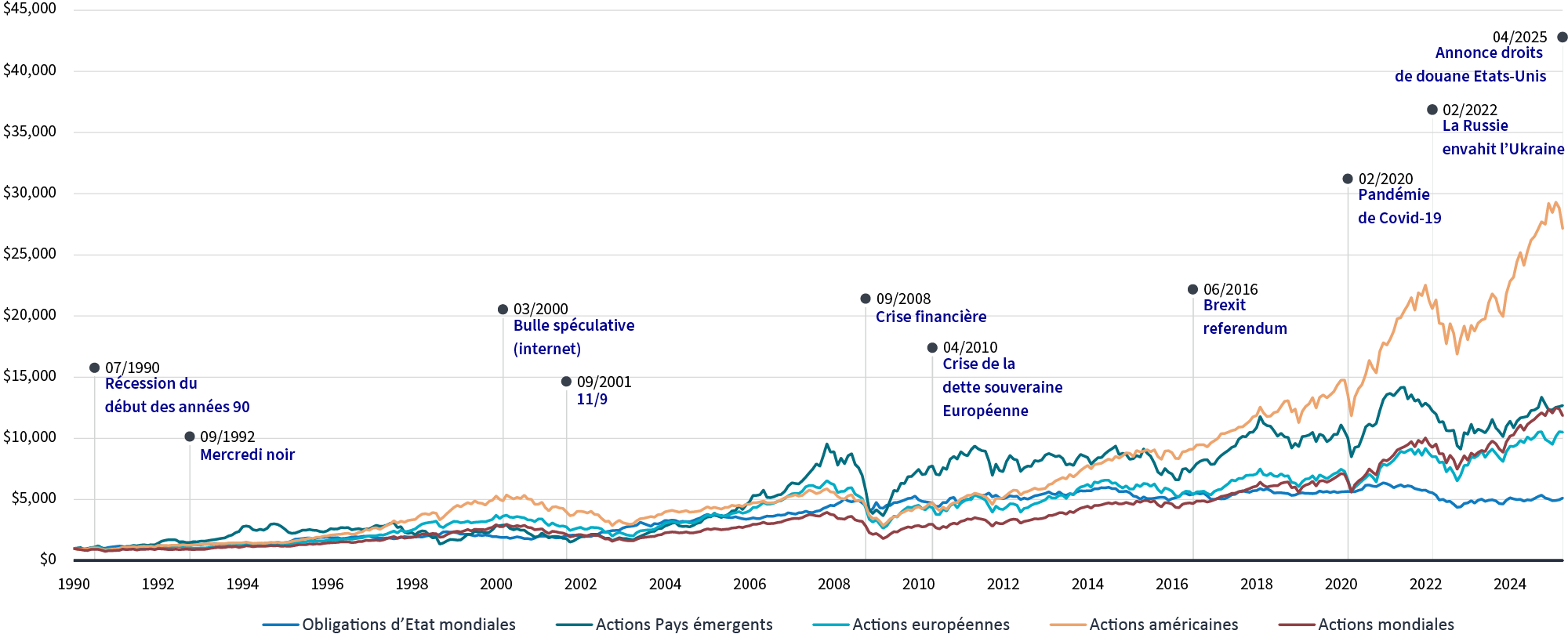 Au fil des années, de nombreux événements ont influencé considérablement les marchés financiers, du mercredi noir de 1992 à la crise financière plus récente de 2008. Pourtant, comme vous le constatez dans le graphique ci-dessous, la tendance à long terme des performances du marché a continué de rester positive. Si vous investissez sur le long terme, vous serez confronté de temps à autre à des mouvements de ventes et à la volatilité, mais l’historique nous montre que ces événements n’entravent en rien les performances positives des marchés sur le long terme. N’oubliez cependant pas qu’il n’existe aucune garantie et que les performances passées ne préjugent en aucun cas des performances futures.