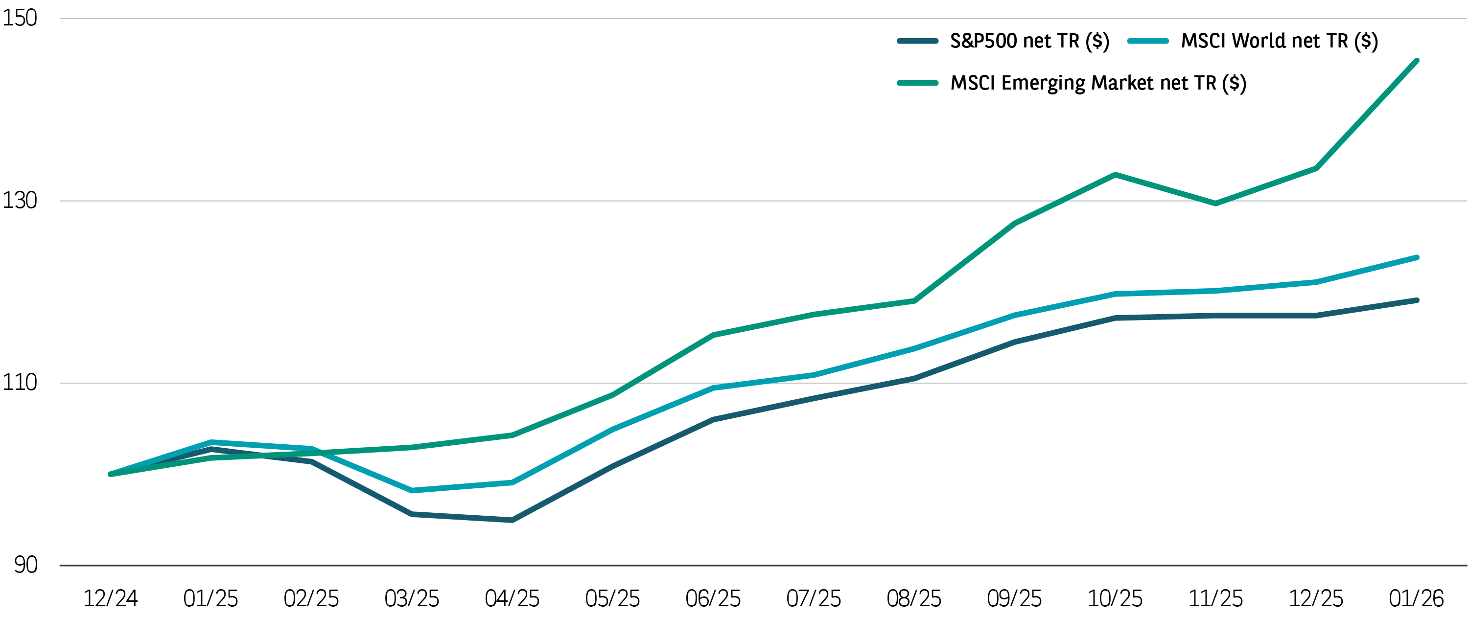 Source : Bloomberg, 19/02/2026, Indice (31/12/2024 = 100), rendement total net en US$
